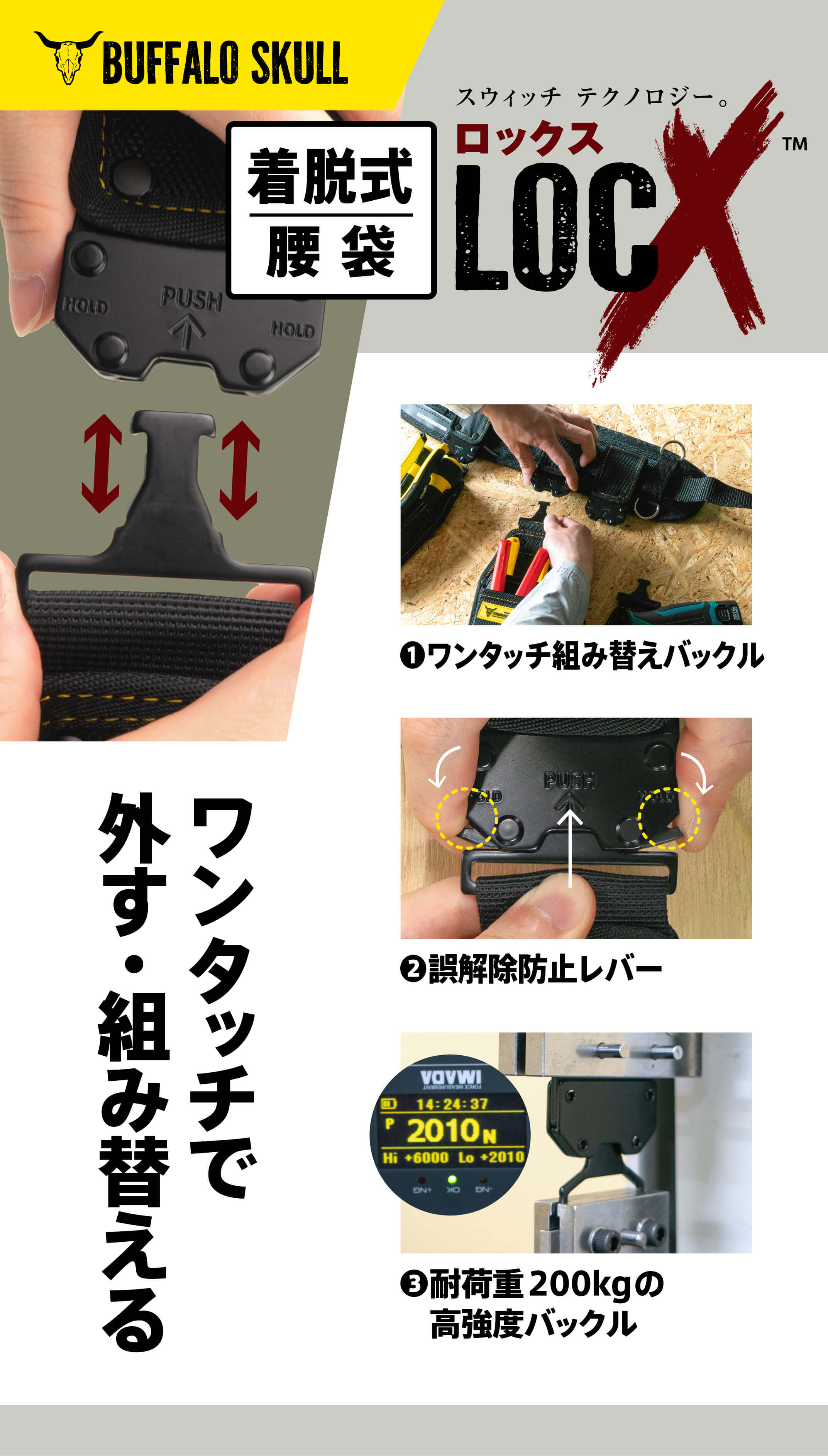 作業に応じてカンタンに工具差しを外す・組み替えられる新機構バックル。